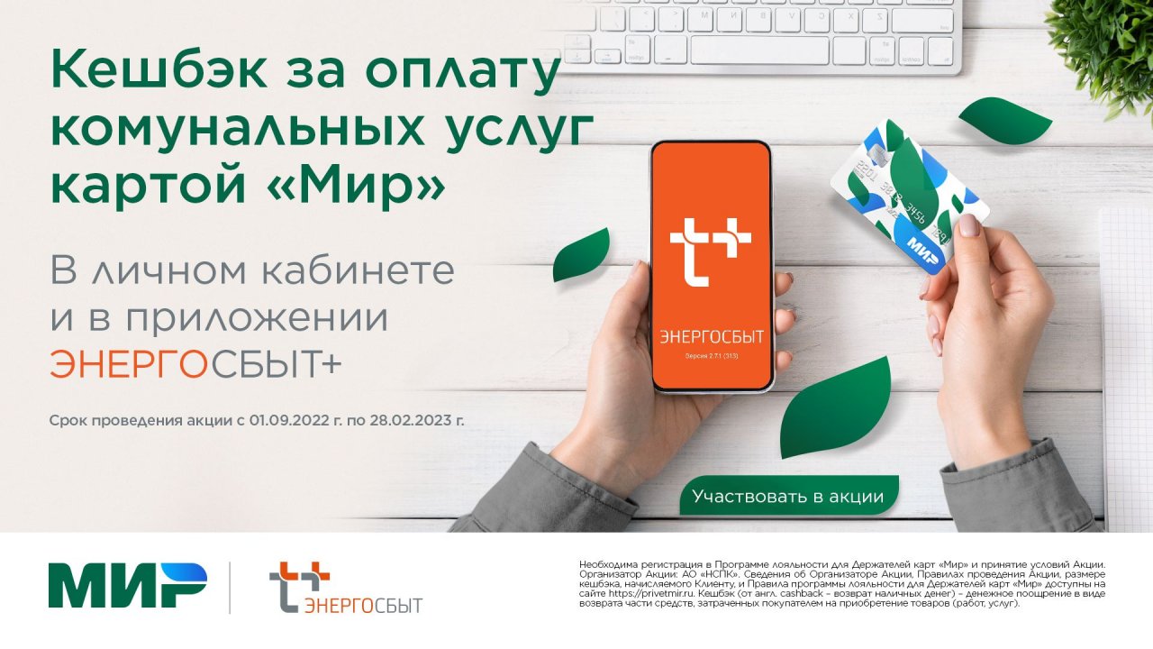 С 1 сентября 2022 года по 28 февраля 2023 года АО "ЭнергосбыТ Плюс" и платежная система "Мир" проводят акцию для пользователей Личного кабинета клиента и мобильного приложения "ЭнергосбыТ Плюс" (доступно в AppStore и GooglePlay).