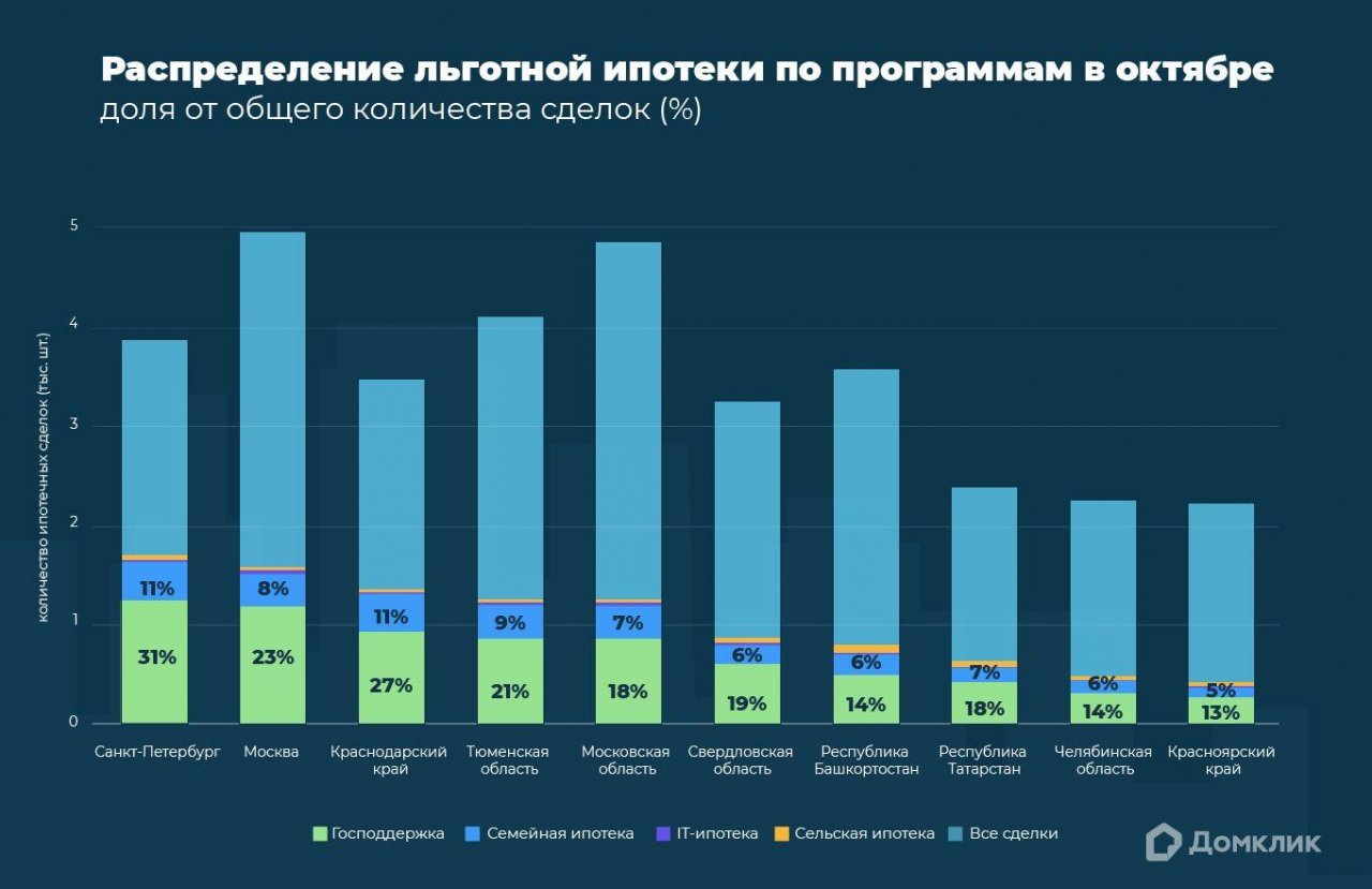 В октябре на фоне общего снижения интереса к новостройкам доля сделок по льготной ипотеке в целом по стране снизилась на 3,3 процентных пункта по сравнению с сентябрем — до 24,6%. Сильнее всего из крупных регионов России доля снизилась в Москве (-8,1 процентных пункта), Московской области (-7,2 процентных пункта) и Краснодарском крае (-5,6 процентных пункта).