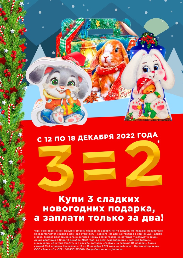 В супермаркетах торговой сети "Система Глобус" традиционно представлено более 130 видов сладких новогодних подарков по цене от 149,99 рубля. И все-все с симпатичными котиками и кроликами! В наших подарках вы найдете самые вкусные шоколадные конфеты и сладости от проверенных брендов: "Бабаевский", "Рот Фронт", "Славянка". В каждом сладком подарке вас ждет сюрприз — 6 купонов: на пиццу, в кино и боулинг, в парк развлечений Zамания, на бесплатную доставку продуктов от службы доставки "Глобус", и еще один — на скидку при заказе торта.