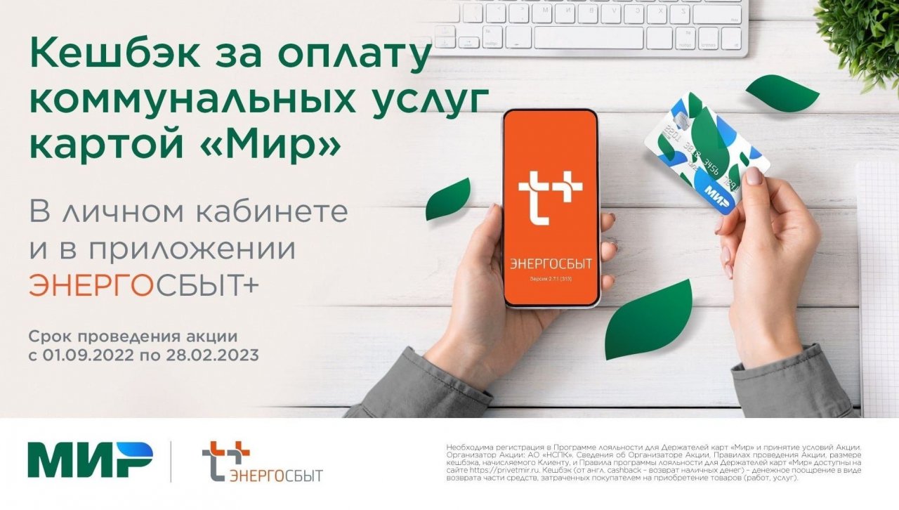 Оплачивайте услуги картой "Мир" в личном кабинете или в приложении "ЭнергосбыТ+" и получайте кешбэк, который можно потратить на оплату коммунальных услуг.
