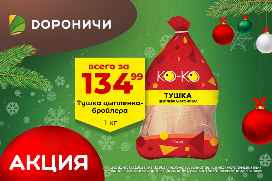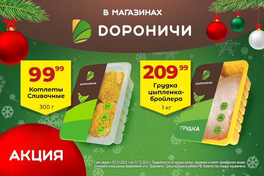 *Срок акции с 01.12.2022 г. по 31.12.2022 г. Подробности об организаторе, правилах и месте проведения акции уточняйте в магазинах фирменной сети "Дороничи". Цены указаны в рублях РФ. Количество товара ограничено.