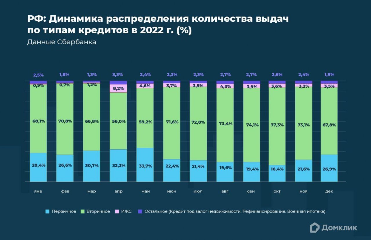 Динамика распределения количества выдач по типам кредитов в 2022 году: приобретение первичного и вторичного жилья, индивидуальное строительство, остальное (кредит под залог недвижимости, рефинансирование, военная ипотека).