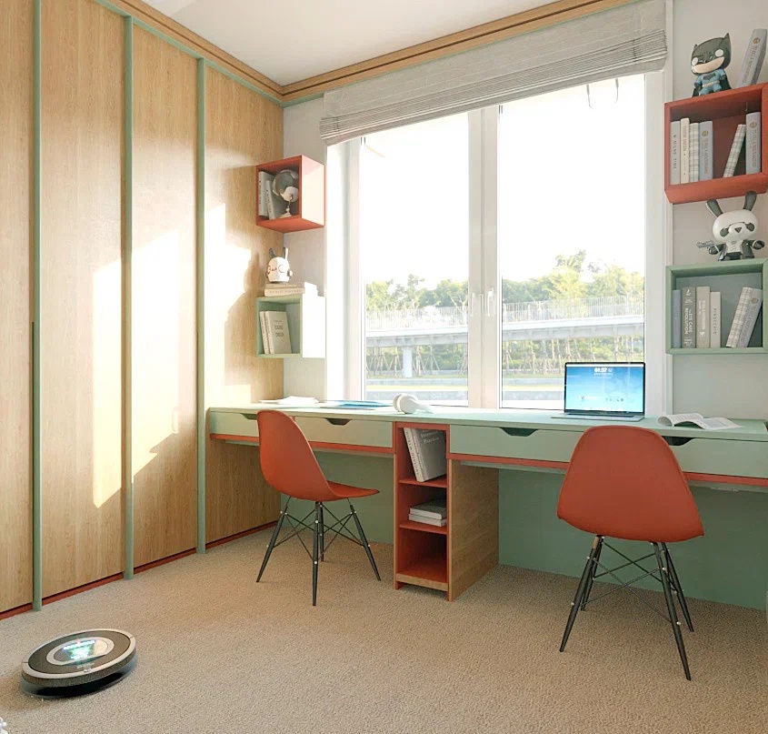Рабочая зона для учеников расположена рядом с окном, чтобы дети получали больше естественного света.