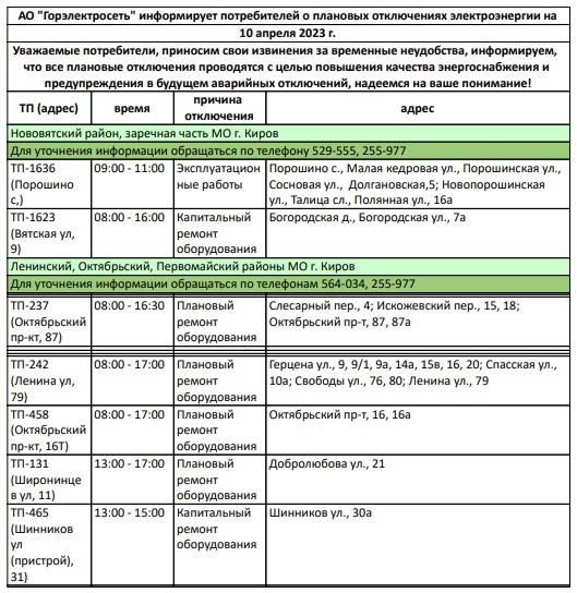 Отметим, что точечные отключения электроэнергии в Кирове пройдут и 9 апреля. С 8 до 10 часов электричества не будет в Нововятске по адресу: улица Советская, 70.