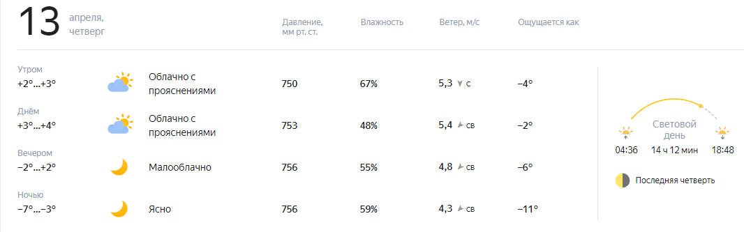 Резкое похолодание ожидается в четверг, 13 апреля. Утром в городе прогнозируется +2...+3 градуса, а днем - +3...+4 градуса. Утром и днем в городе облачно с прояснениями. К вечеру станет малооблачно, а ночью - ясно. Вечером в Кирове прогнозируется -2...+2 градуса, в ночью столбик термометра резко опустится - -3...-7 градусов.