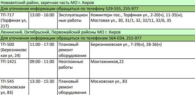 В четверг, 13 апреля, в Кирове пройдут плановые отключения электроэнергии. График опубликовали на сайте “Горэлектросети”. Неудобства носят временный характер, а проводимые работы повышают качество электроснабжения и предупреждают аварии, напомнили в компании.