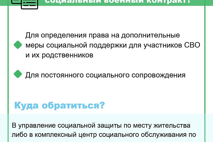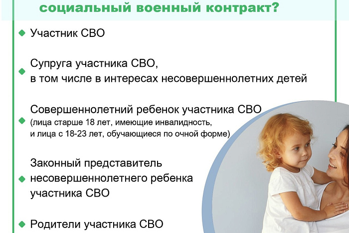 Социальный военный контракт заключается с военнослужащими, подписавшими вновь военный контракт, а также членами семей участников СВО, в том числе погибших и демобилизованных. В Кировской области уже начали заключать социальные военные контракты.