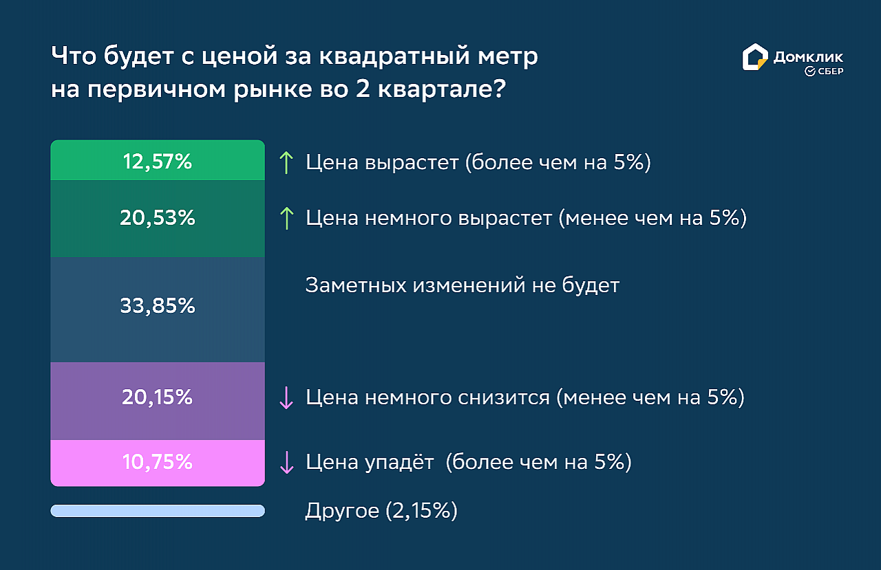 Мнения экспертов относительно динамики стоимости первичной недвижимости разделились почти поровну. Примерно треть риелторов прогнозируют, что цены вырастут, треть — что упадут, а ещё треть — что существенно не изменятся.