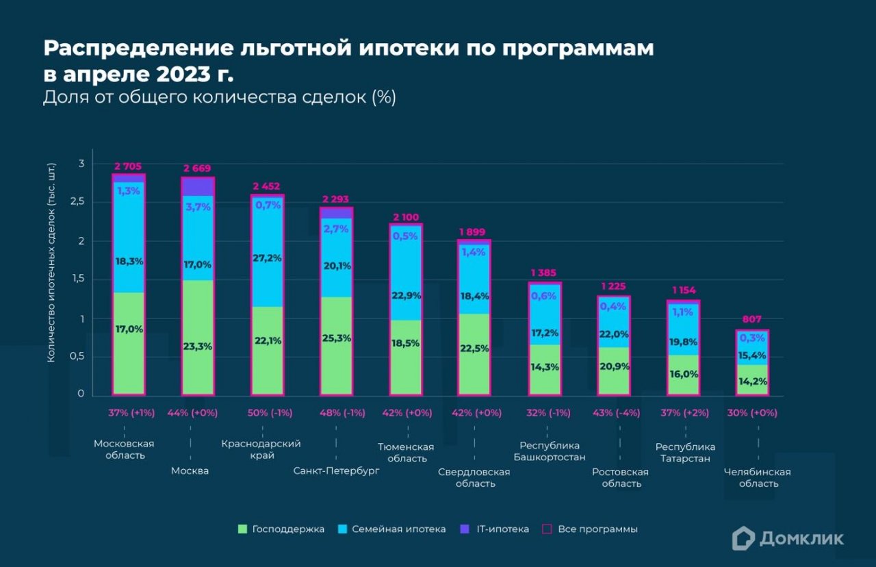 Количество выданных кредитов по льготным программам в апреле 2023 года (топ-10 регионов страны по количеству выдач). Количество сделок по программе "Господдержка" и доля выдач относительно общего количества ипотек за месяц показаны зелёным, количество сделок и доля выдач по "Семейной ипотеке" — синим, по "IT-ипотеке" — фиолетовым. Сделки по "Сельской ипотеке" и "Дальневосточной ипотеке" в данных регионах отсутствуют. Данные отсортированы по суммарному количеству сделок по всем льготным программам.