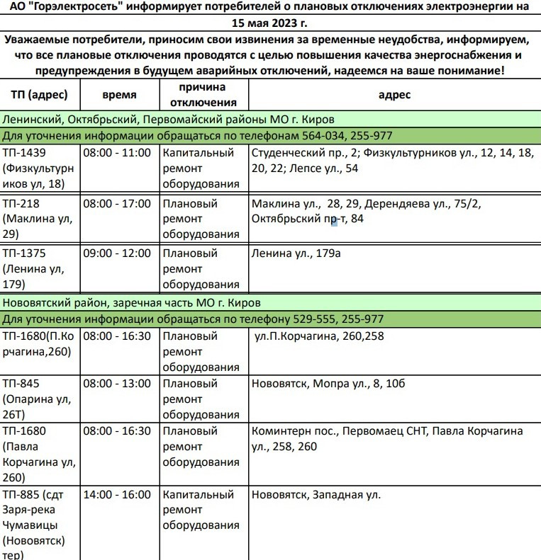 15 мая часть Кирова останется без света