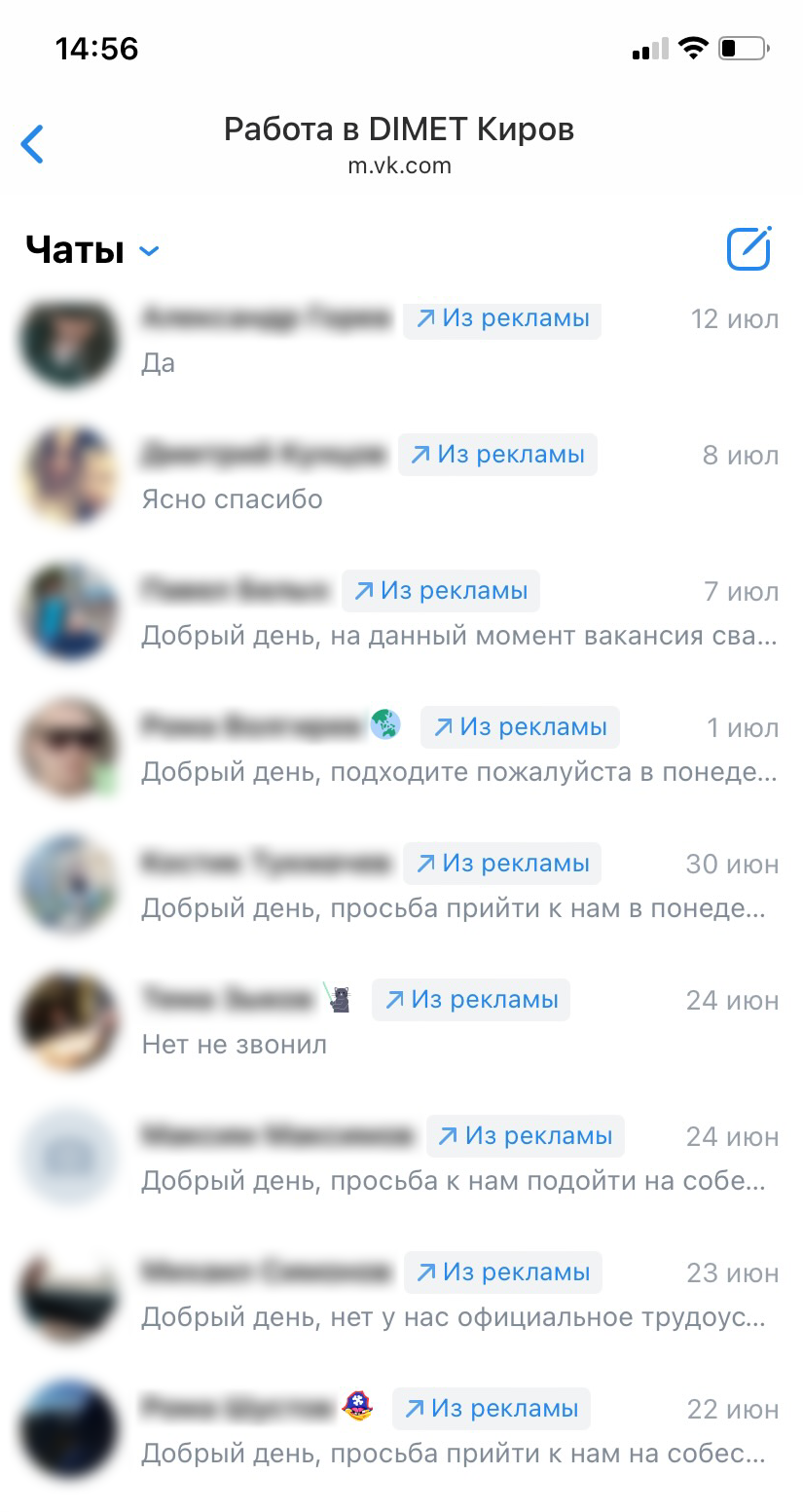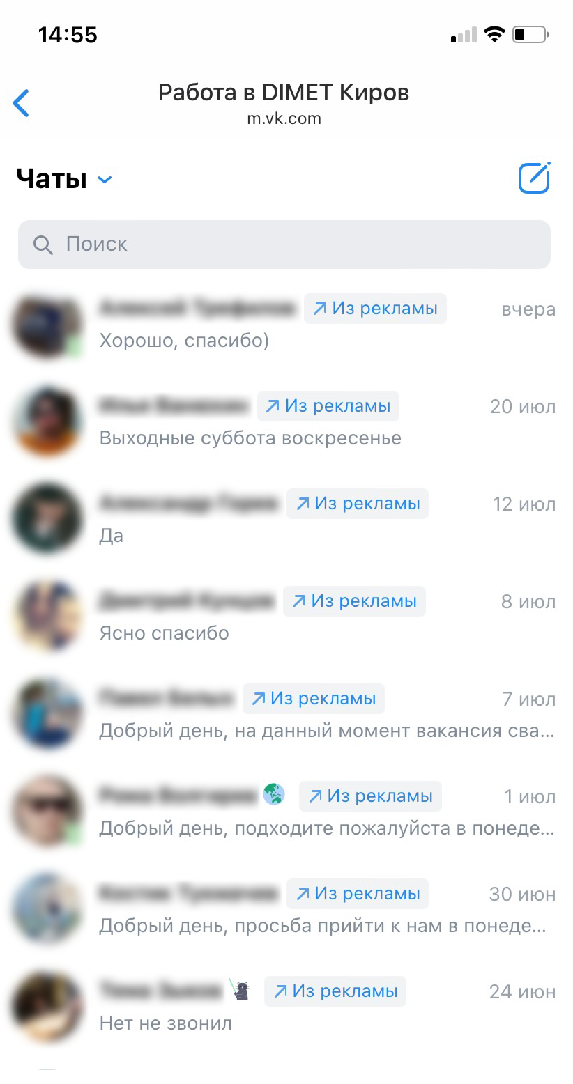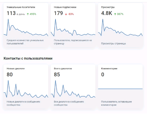 еЗа месяц: • Освоено бюджета - 9535 рублей • Показы - 119592 • Клики/Переходы - 2075 • Уникальные посетители в день - 113 (+ 495%) • Новые подписчики - 179 человек • Новые диалоги - 85 диалогов, помимо звонков. • Средняя цена клика - 4 рублей По итогу работы клиент отметил активность группы и интерес кандидатов к вакансиям в соцсети во ВКонтакте. Через в группу с момента запуска было на назначено ряд собеседований на весь перечень вакансий.